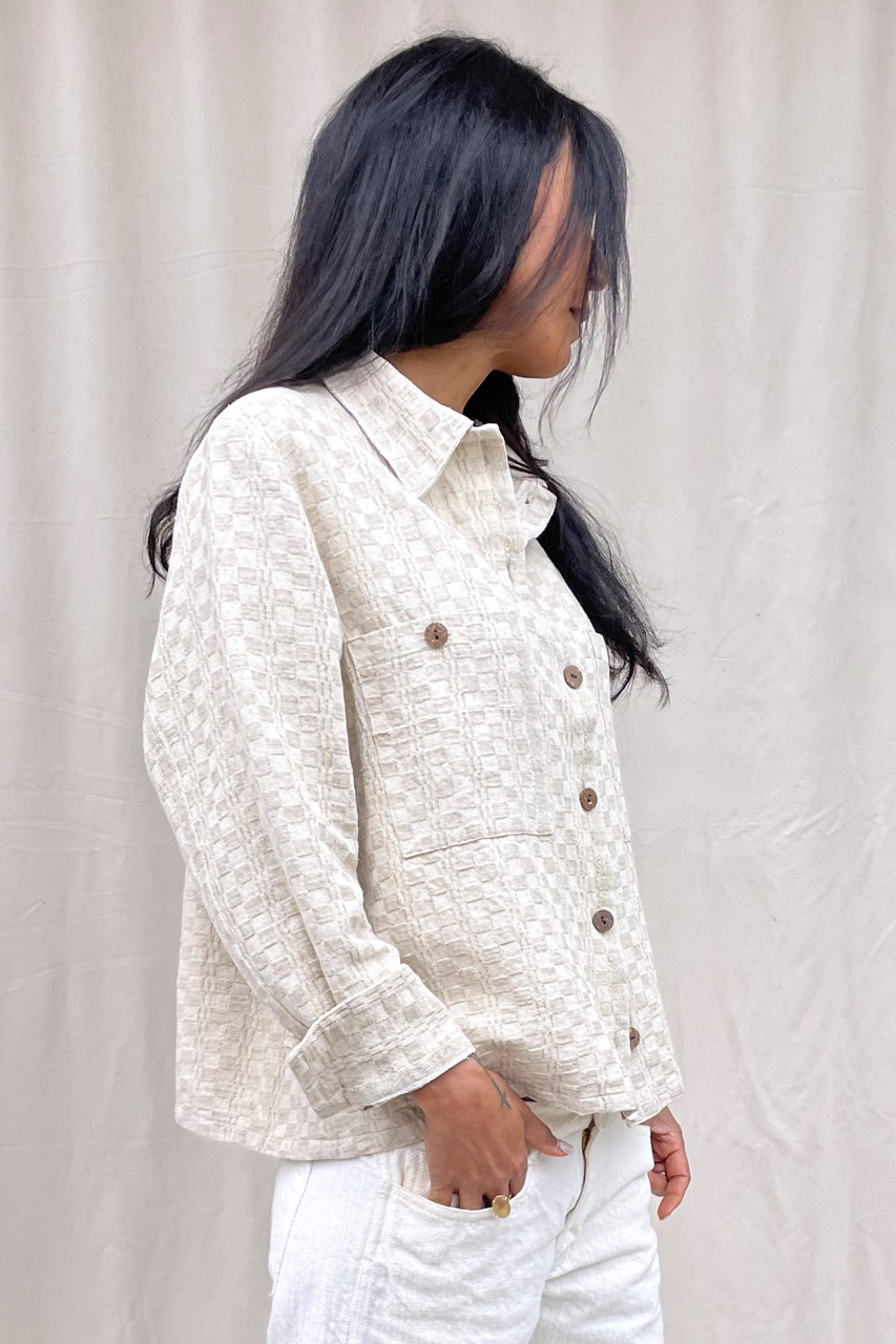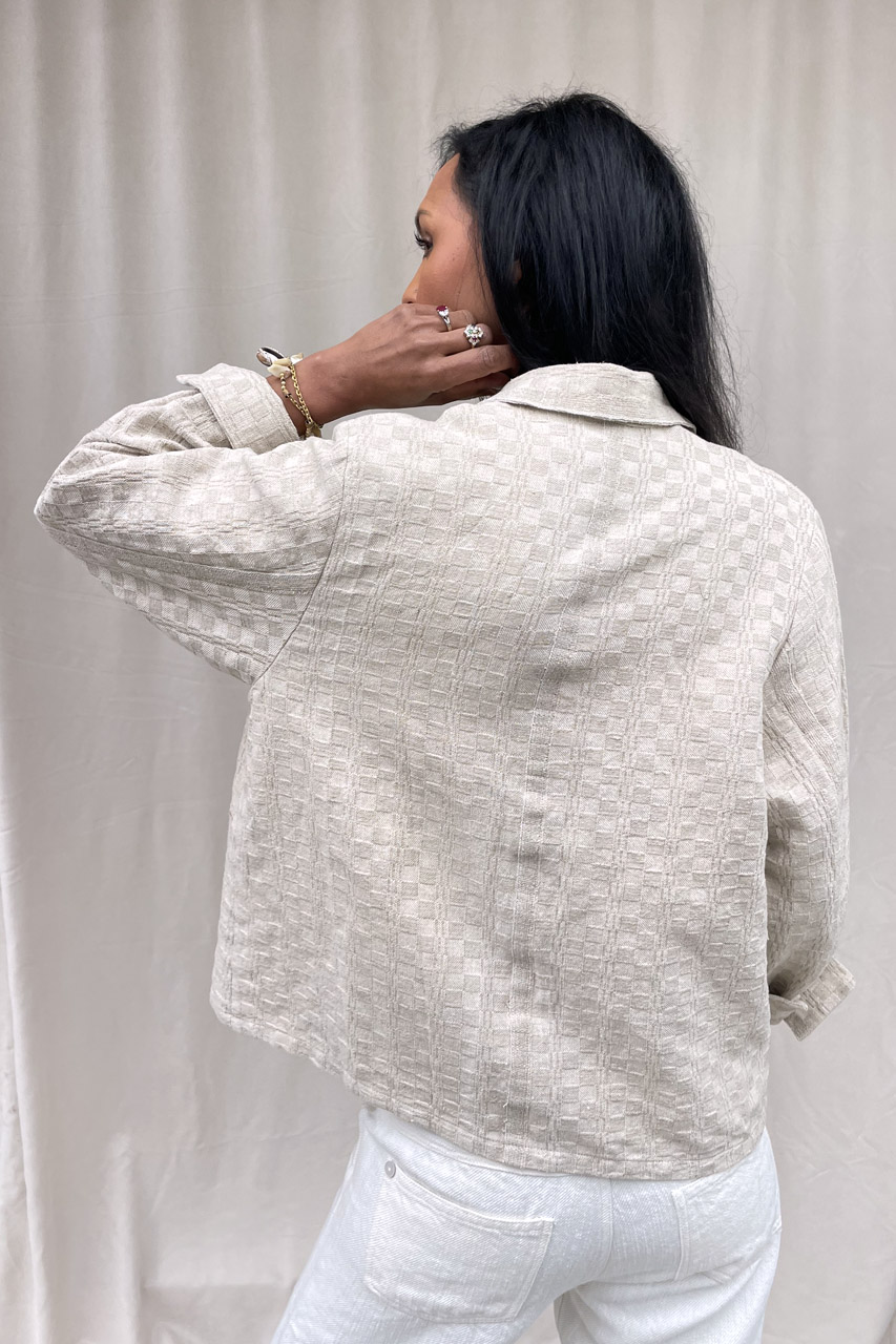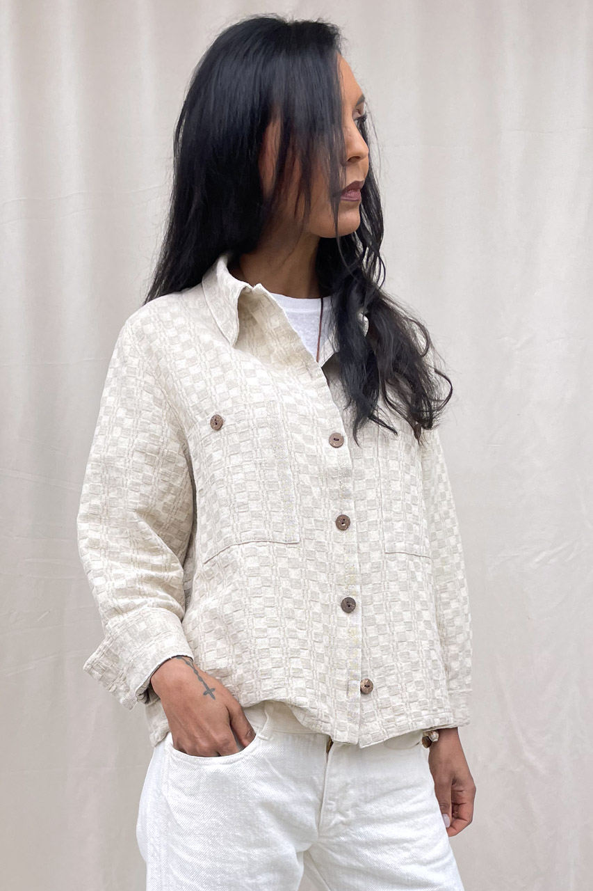 Fenice è una giacca-camicia decostruita dalla linea dritta e morbida, caratterizzata da un aspetto grezzo e autentico. Fenice esprime forza e naturalezza attraverso la materia. Il suo carattere nasce dal tessuto antico, dal colore corda naturale e dalla lavorazione a quadretto che ne definisce l’identità.